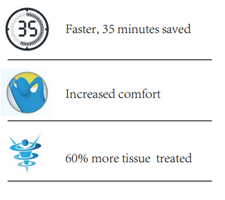 New Cool 360°surrouding cooling system gives even cooling 60% faster from all angles, improving efficiency and results. The larger encompassing of target area, more fat cells can be targeted and killed per treatment