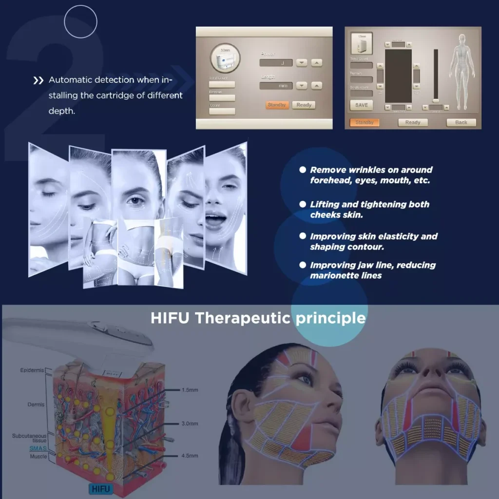 SanosaADSS HIFU procedure stimulates collagen production by delivering energy to the skin’s foundational layer typically addressed in cosmetic surgery—without cutting or disrupting the surface of the skin. Coagulation zone into 4.5mm Depth(SMS layer)  and 3mm.